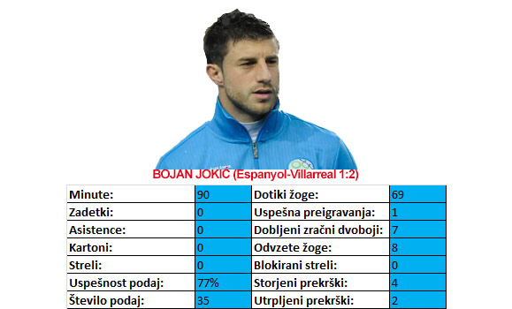| Bojan Jokić* | Espanyol-Villarreal 1:2 | Igral vseh 90 minut. |