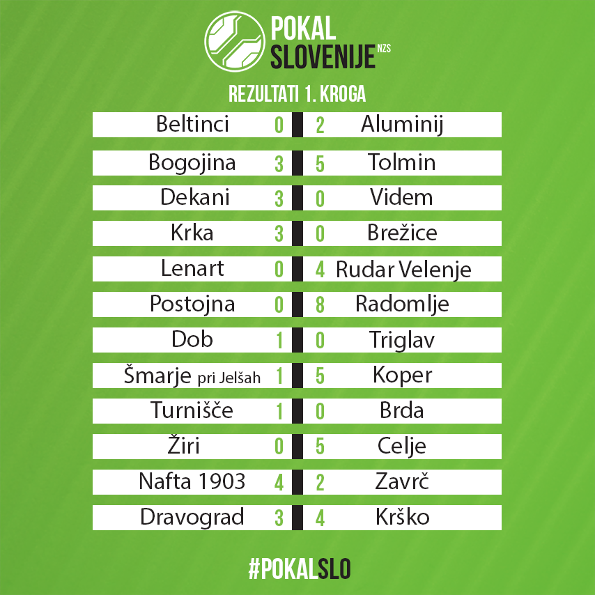 Slovenski nogometaši so odigrali prvi krog Pokala Slovenije. Celjani so visoko, s kar 5:0 odpravili Žiri, Matej Podlogar je mrežo Notranjcev zatresel dvakrat. Med prvoligaši so visoko zmago zabeležili tudi pri Kopru, ki je s 5:1 ugnal Šmarje pri Jelšah, Radomlje pa so s kar 8:0 odpravile Postojno.