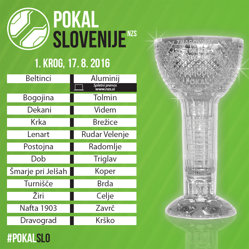 Tekme prvega kroga bodo sicer izpustili Damjan Vuklišević (Krško), Jaka Lipužič Bratuž (Tolmin) in Rok Burjek (Žiri). Z izjemo tekme v Lendavi, kjer se bosta Nafta in Zavrč v boj za napredovanje podala ob 18. uri, se bodo pokalni dvoboji pričeli ob 16:00, v spletnem prenosu na NZS.si si boste lahko ogledali srečanje Beltincev in Aluminija.