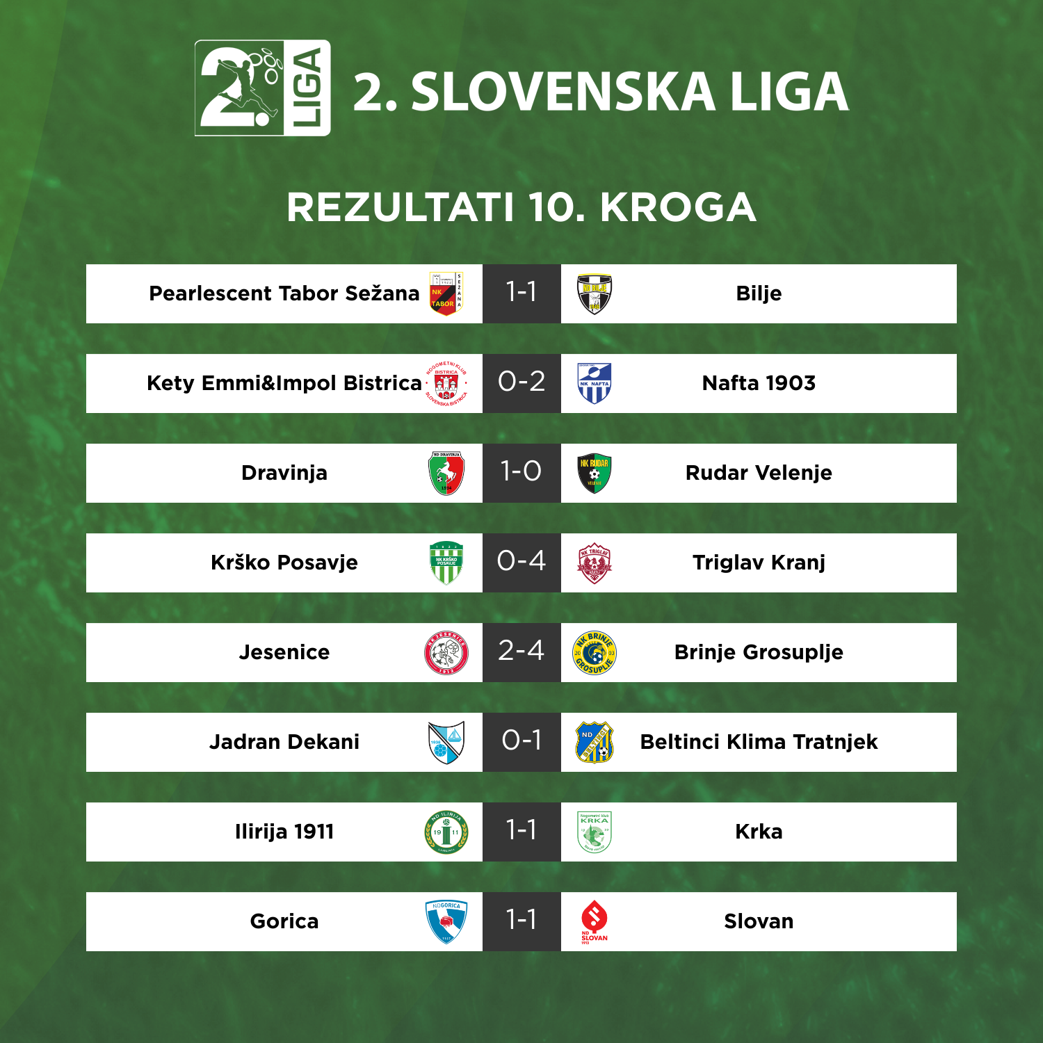 Uvodni dvoboj desetega kroga 2. SNL med Taborom in Biljami ni dal zmagovalca. Grosupeljčani in Lendavčani ostajajo na vrhu lestvice, Brinje je slavilo na Jesenicah, Nafta 1903 je v Kidričevem premagala Bistrico, na tretje mesto pa so s šesto zaporedno zmago skočili Beltinčani.