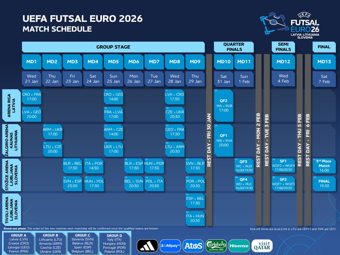 Odštevanje do največjega futsal dogodka se je začelo! Med 21. januarjem in 7. februarjem 2026 bo Slovenija, skupaj z Latvijo in Litvo, gostila UEFA Futsal Euro 2026, na katerem bo nastopilo 16 najboljših evropskih reprezentanc.